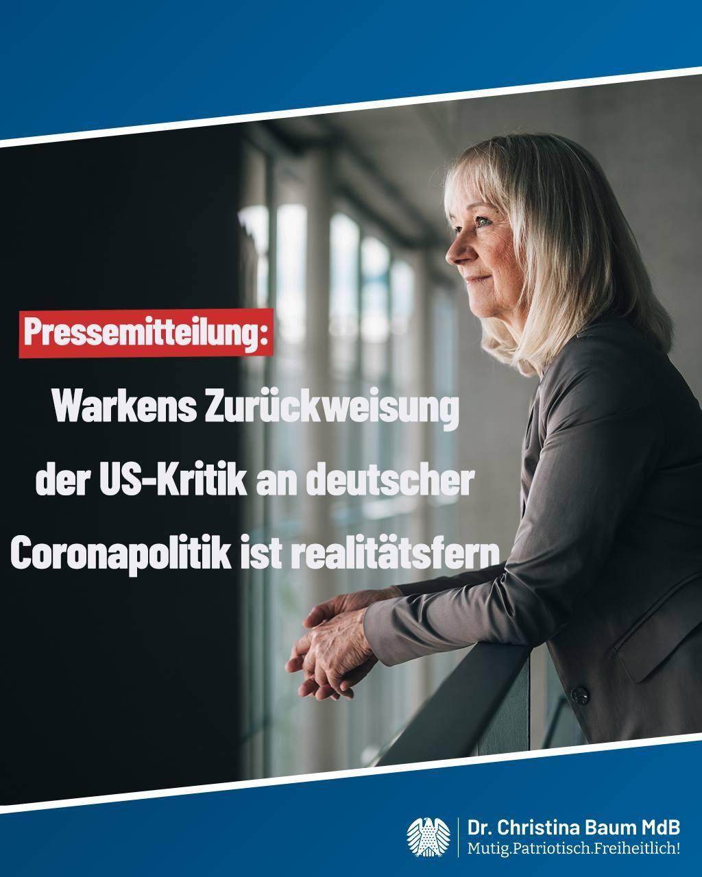 Berlin, 12. Januar 2026. Zur Zurückweisung der Kritik des US-Gesundheitsministers Robert Kennedy an der deutschen Coronapolitik durch die Bundesgesundheitsministerin Nina Warken teilt die AfD-Bundestagsabgeordnete Christina Baum, Mitglied im Gesundheitsausschuss, mit: