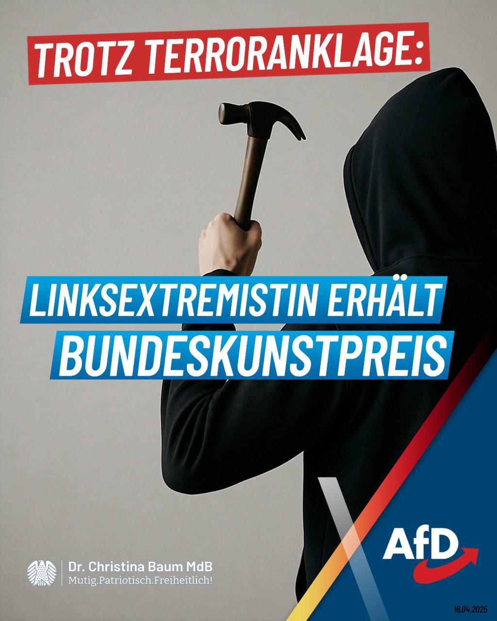 Der Bundeskunstpreis ist mit sagenhaften 30.000 Euro dotiert und obendrauf gibt es für die Linksextremistin noch ein Produktionsstipendium von insgesamt 18.000 Euro.