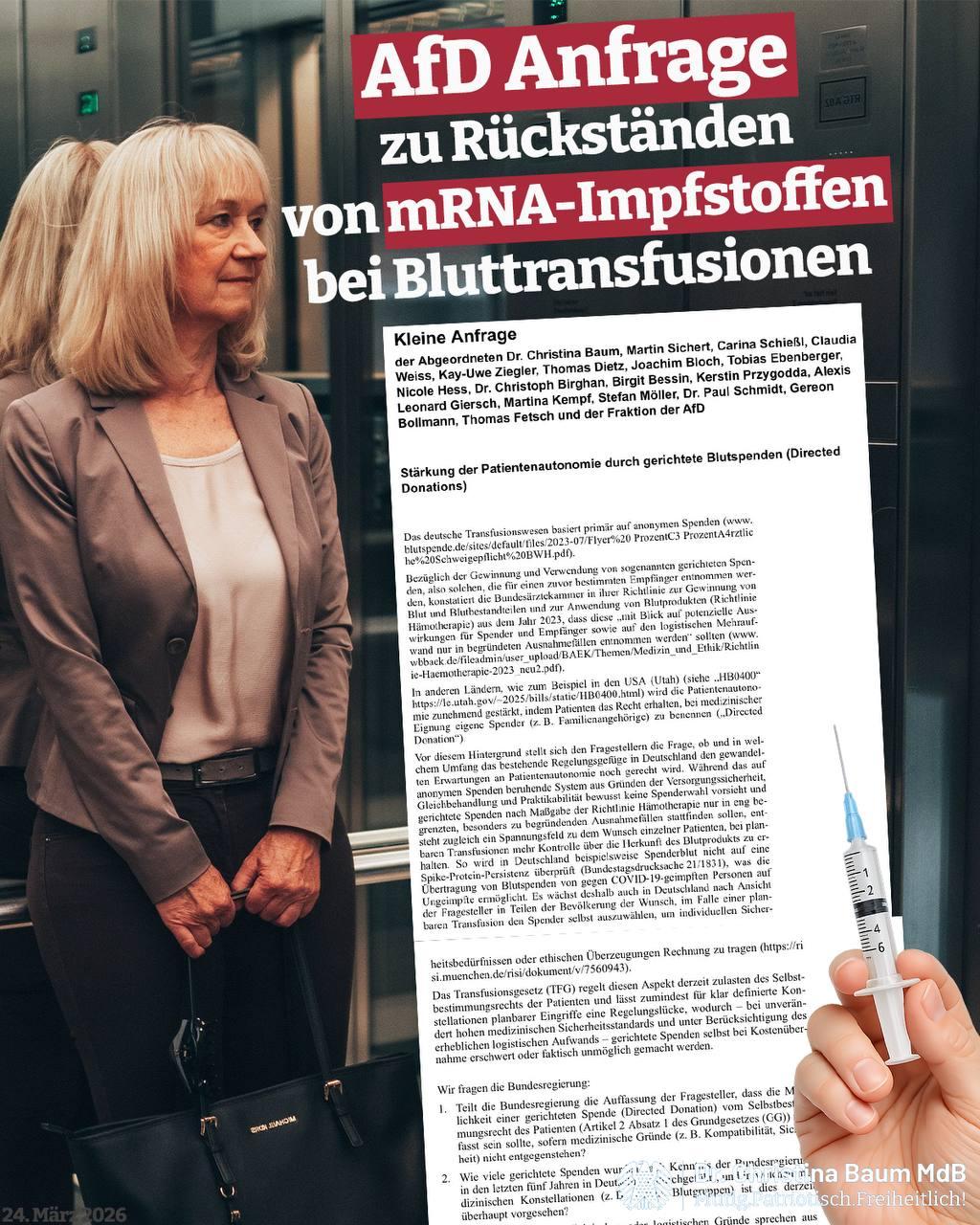 Mich erreichen immer wieder zahlreiche Nachrichten von besorgten Bürgern, die bei planbaren Bluttransfusionen aus tiefer Sorge vor möglichen Rückständen von mRNA-Impfstoffen, insbesondere des Spike-Proteins, unbedingt Spenden von ungeimpften Personen –also gerichtete Spenden von Familienangehörigen oder Bekannten – bevorzugen. Sie fordern mehr Kontrolle über ihr eigenes Blut und ihren Körper, um ihre Selbstbestimmung zu wahren, da Spenderblut in Deutschland nicht auf Spike-Proteine überprüft wird: