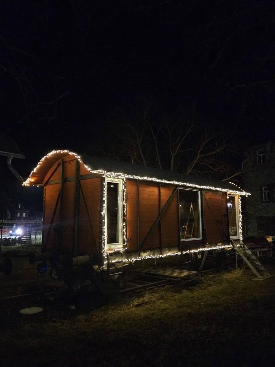 Trotz all der anspruchsvollen Arbeiten ist inzwischen sogar ein Hauch von weihnachtlicher Stimmung in den Waggon eingezogen: ein gemütliches Leuchten, das die schweißtreibende Arbeit in eine beinahe festliche Atmosphäre taucht.