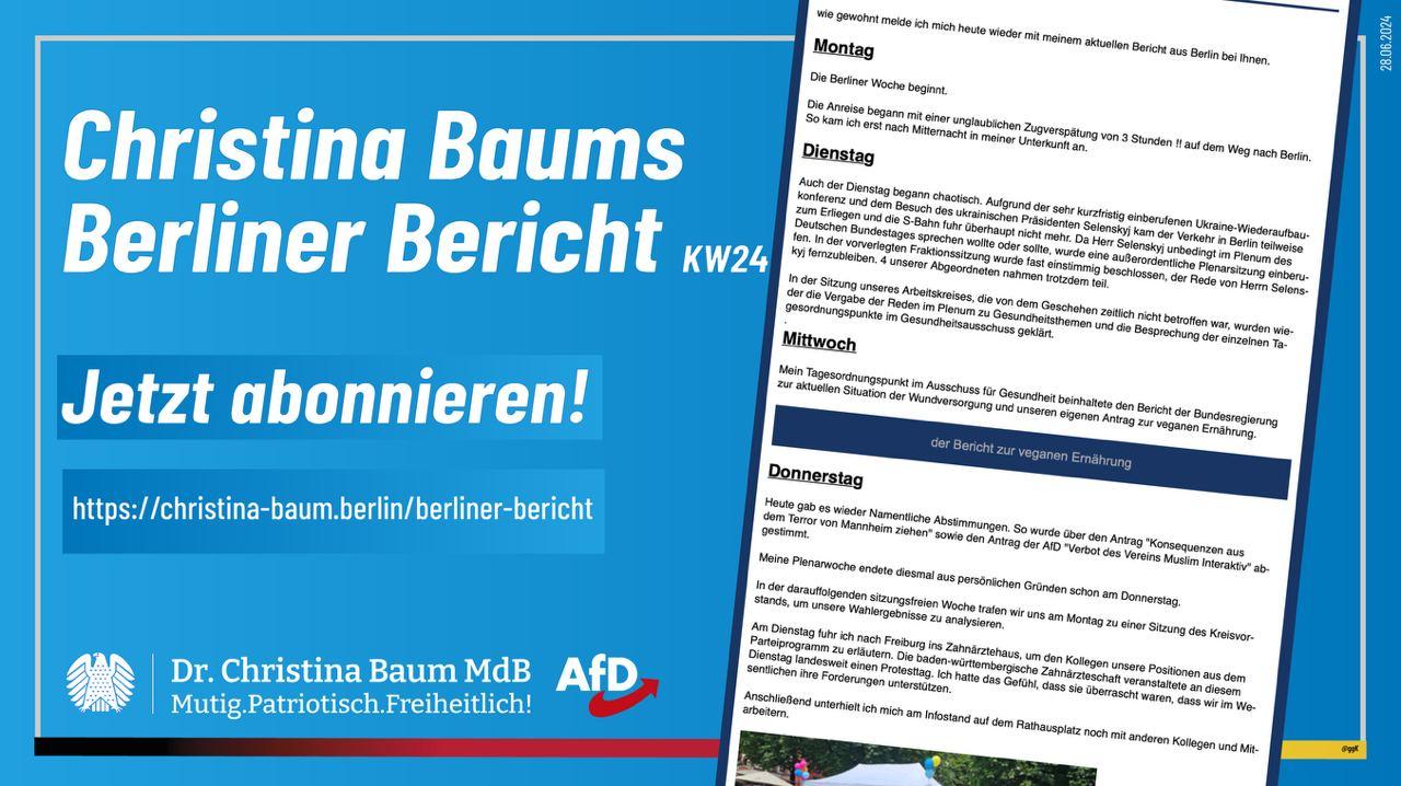 Ab der nächsten Ausgabe ist Frau Dr. Baums Berliner Bericht dann immer pünktlich bei Erscheinen im Mail-Posteingang.