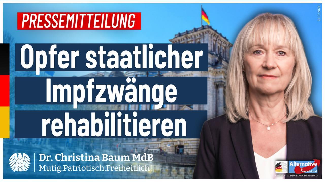Zu den jüngsten Aussagen von Gesundheitsminister Karl Lauterbach, nach denen es richtig gewesen sei, dass die Impfpflicht abgelehnt wurde, teilt die AfD-Bundestagsabgeordnete Christina Baum, Mitglied im Gesundheitsausschuss, mit: